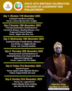 Media Office of Chief (Dr.) Peter Taiwo Ogundeji (A.K.A. APATA), a distinguished philanthropist, entrepreneur, and Chief Executive Officer of the APATA CARES FOUNDATION, has announced a series of week-long events to commemorate his 40th birthday anniversary in a statement.